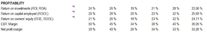 – Return On Equity (ROE) trung bình ở mức 24.71%, đồng nghĩa với việc nếu đầu tư vào FB thì khoảng 4 năm sau là hòa vốn và sinh lời.