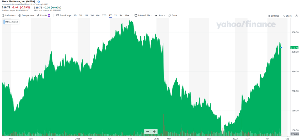 Chính vì sự không khoan nhượng và chiến đấu quyết liệt trên nền tảng tốt có sẵn, Meta đã có một cú lội ngược dòng ngoạn mục làm nức lòng nhà đầu tư lâu năm. Cổ phiếu bị “dập”, rớt dần đều về đáy lịch sử $88 vào ngày 3/11/2022 (giảm 77% từ đỉnh). Đây cũng là lúc Meta được nhiều nhà đầu tư lão luyện mua vào bằng tất cả số tiền mặt họ có. Để rồi tới hiện tại sau 9 tháng, cổ phiếu đã đi một mạch từ đáy lên $310, tức tăng khoảng 250% (x2.5 trong truyền thuyết). Những ai đã chịu nằm gai nếm mật, tin tưởng vào những phân tích dài hạn của bản thân mình, thì có lẽ bây giờ đang được hưởng trái ngọt.